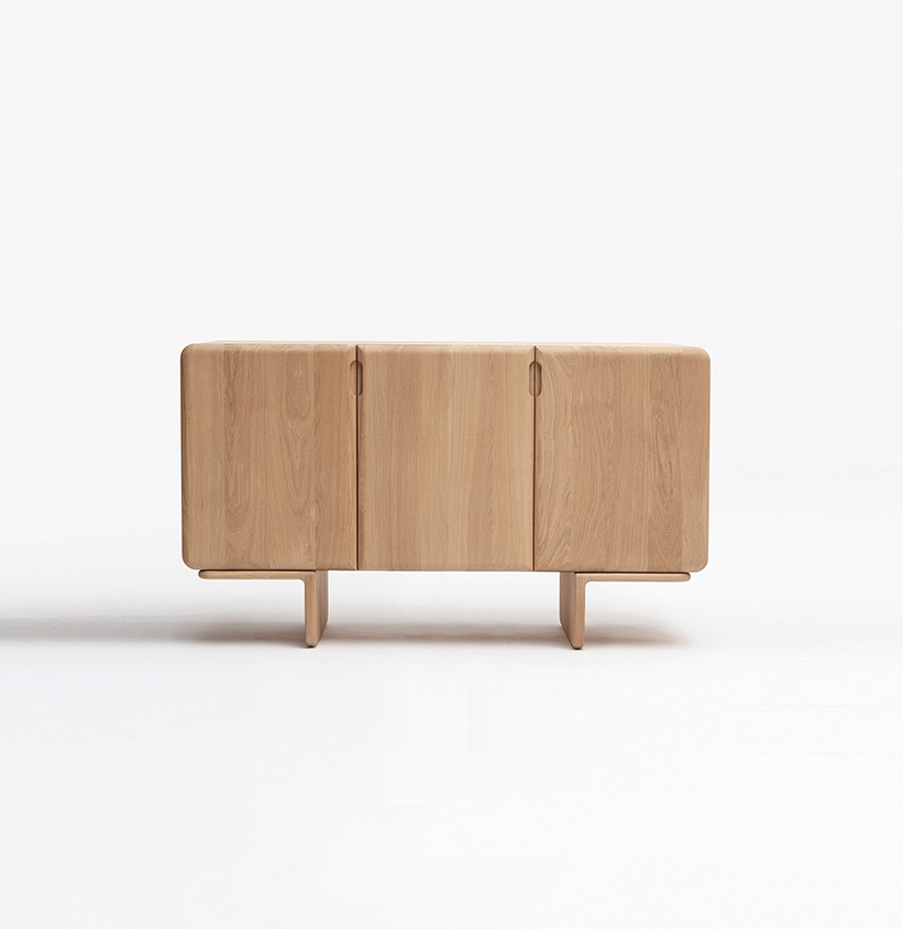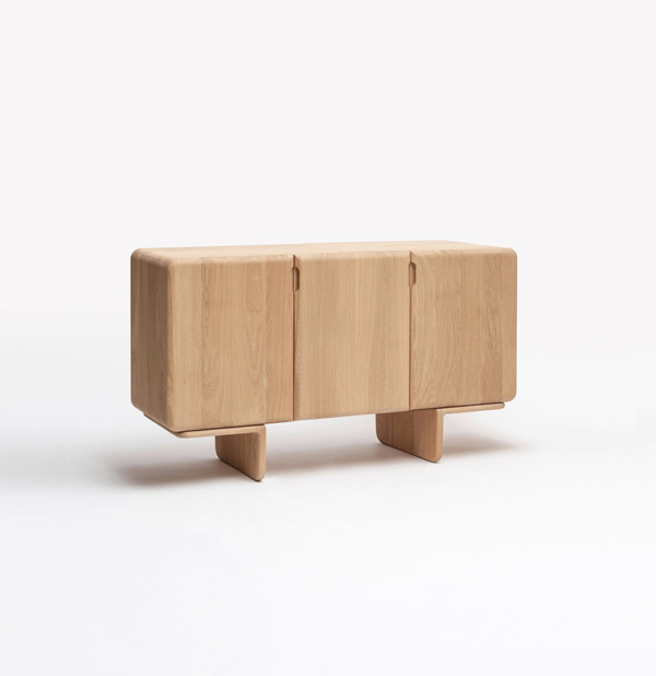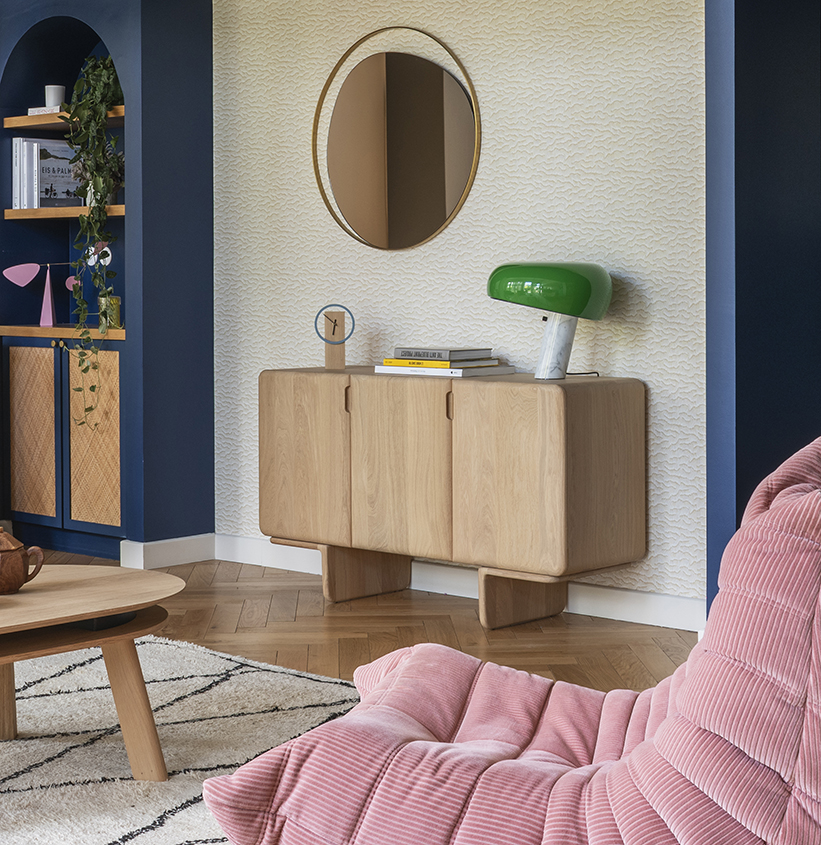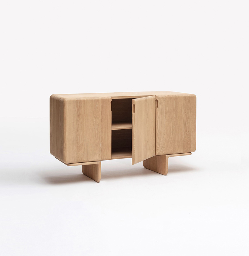 Le travail des ébénistes et la sensualité du chêne massif se révèlent dans les lignes arrondies et douces du BUFFET TÉHÈME : poignées creusées dans le bois, charnières