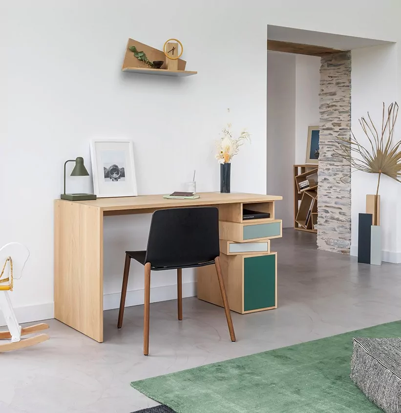 fonctionnalités d’un bureau classique. Le dessus est équipé d’une prise pour brancher ou recharger son portable. Couleurs personnalisables, fabriqué en France en chêne massif.