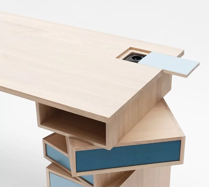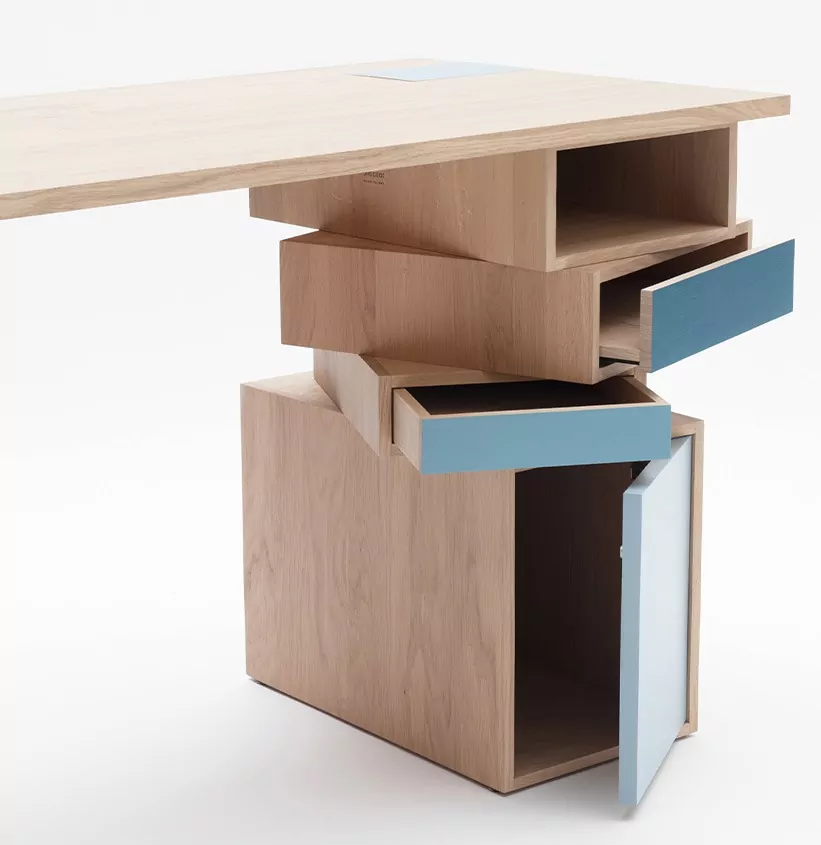 Opposition entre un côté sobre et un côté désordonné, le bureau EMPIL joue sur les contrastes. Composé de 4 caissons que l’on fait pivoter à sa guise, il offre les