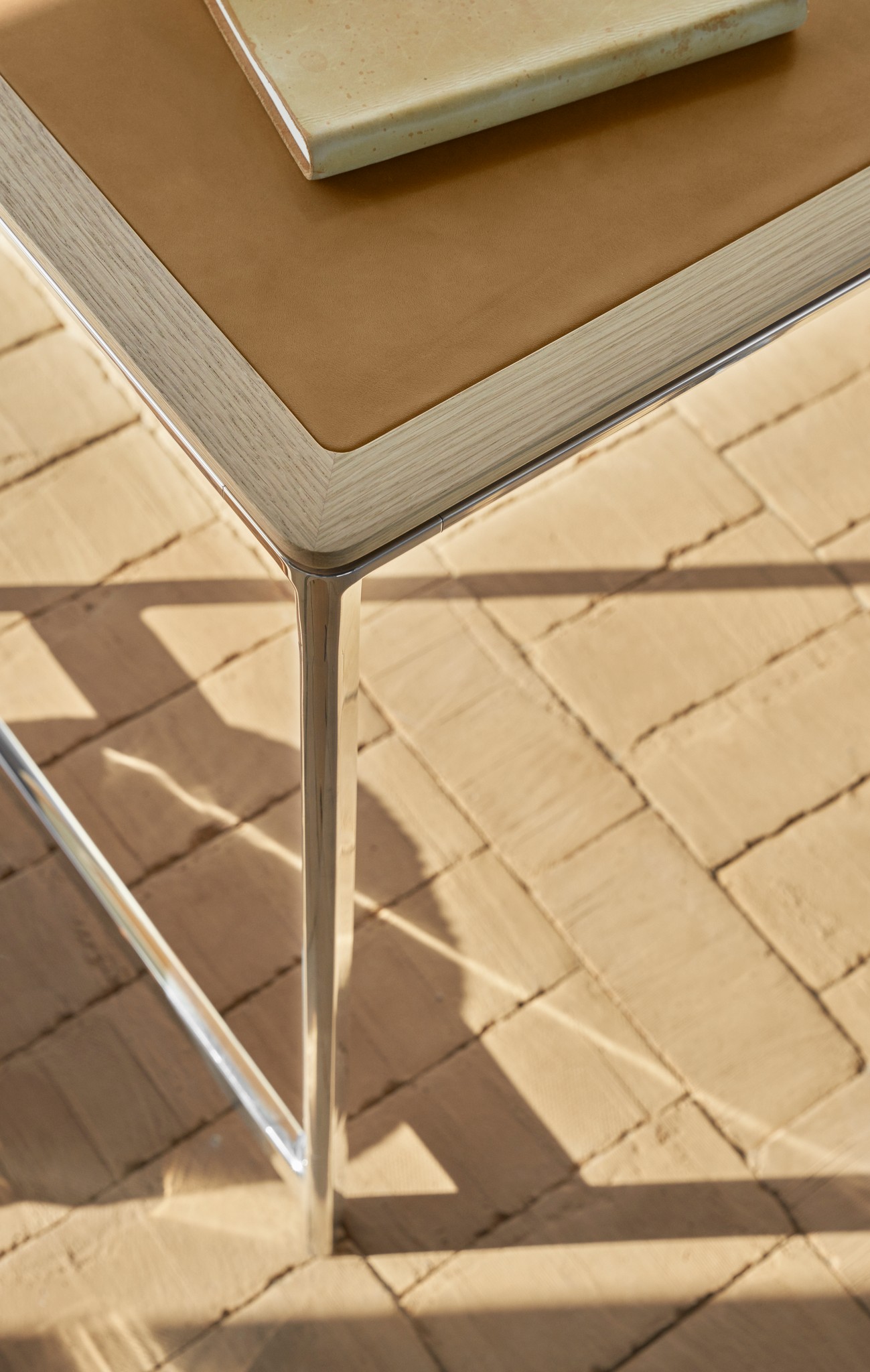 Vipp poursuit son parcours avec l’aluminium naturel en lançant un nouveau bureau à domicile fabriqué en aluminium brut. Le bureau propose un plateau de table disponible en marbre ou en cuir, avec des options en cuir associées à un cadre en noyer ou en chêne clair. Possibilité d’intégré un petit tiroir ( en option)