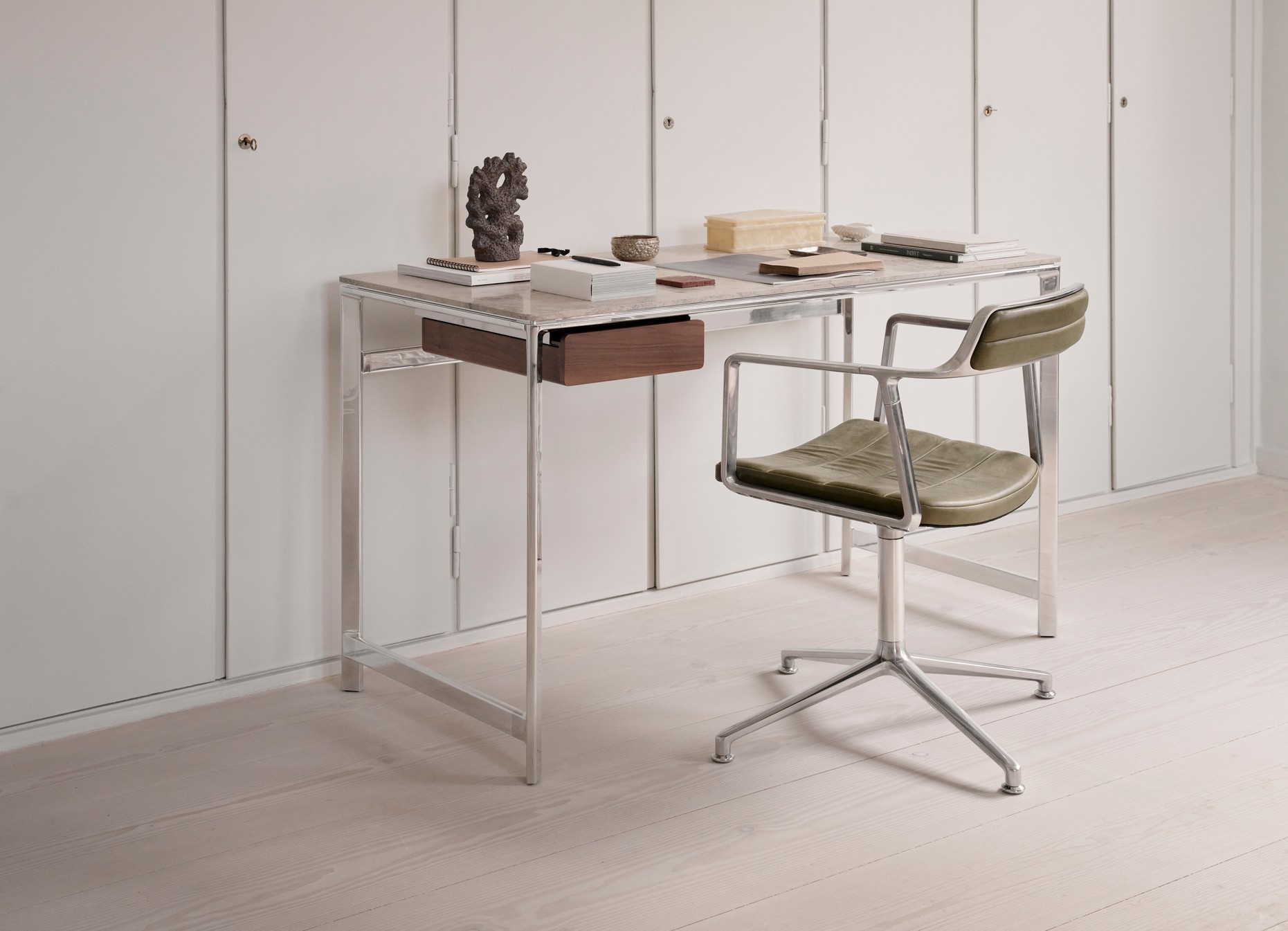 Vipp poursuit son parcours avec l’aluminium naturel en lançant un nouveau bureau à domicile fabriqué en aluminium brut. Le bureau propose un plateau de table disponible en marbre ou en cuir, avec des options en cuir associées à un cadre en noyer ou en chêne clair. Possibilité d’intégré un petit tiroir ( en option)