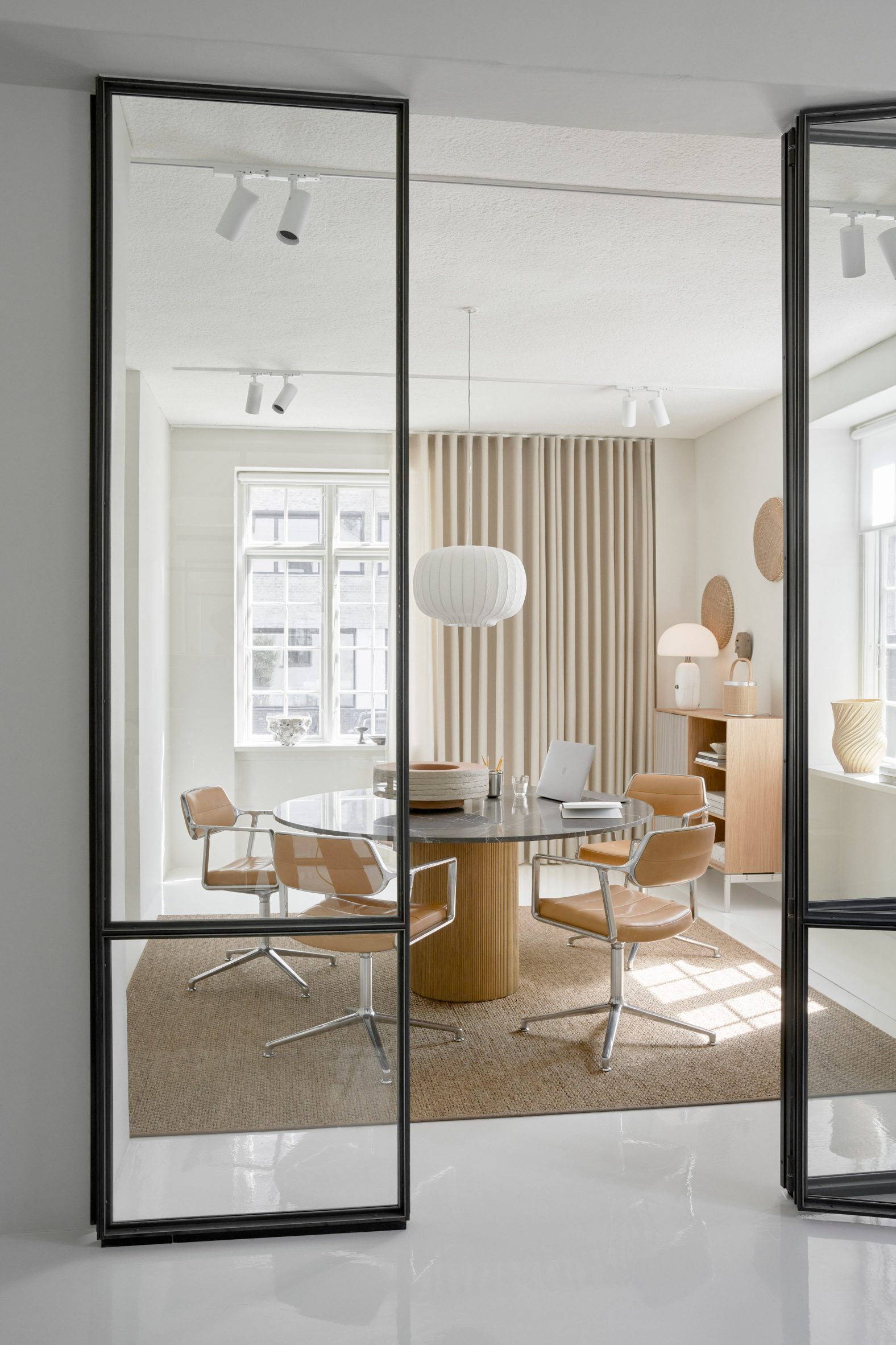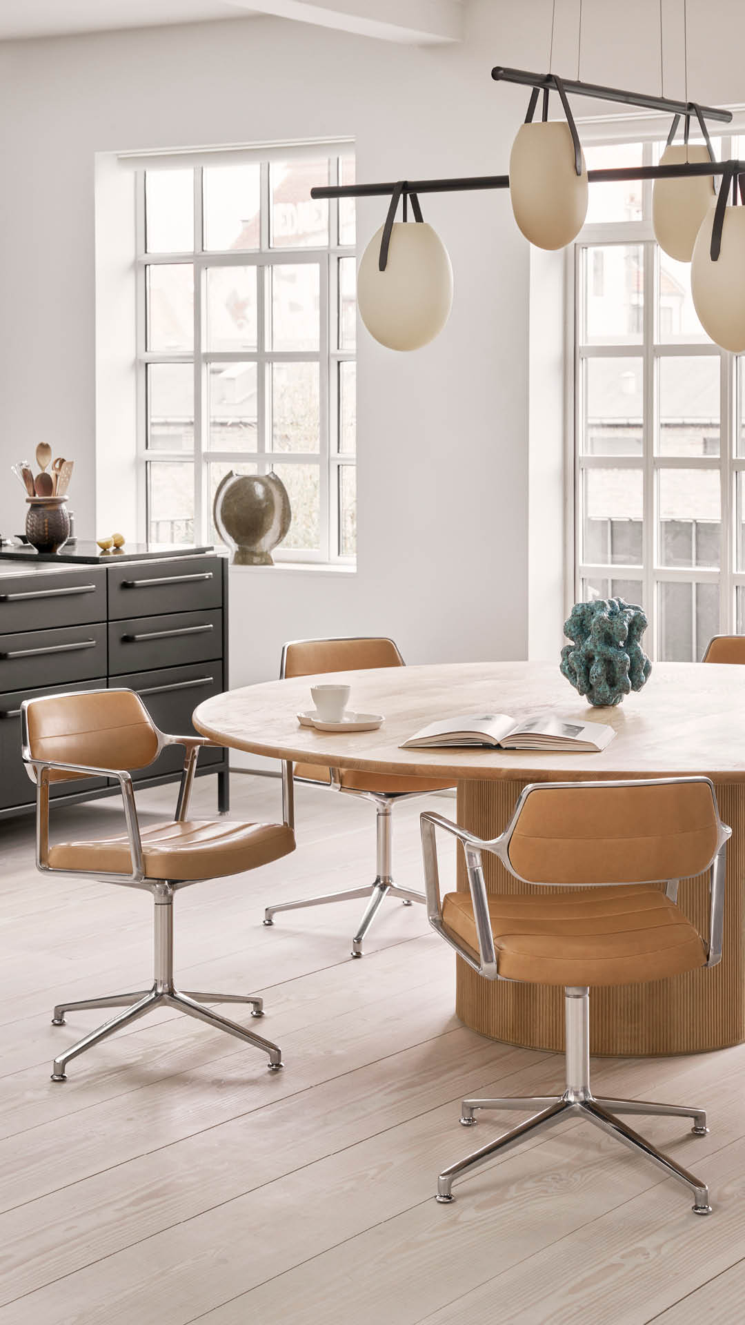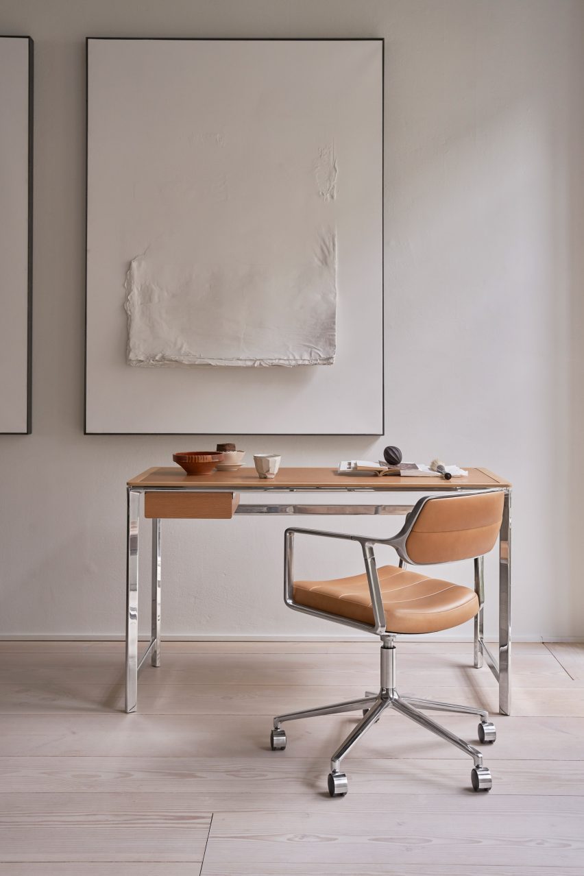 Vipp propose une version extra-rembourrée et réglable en hauteur de sa célèbre chaise pivotante. Conçue pour les bureaux à domicile et les salles de conférence où les gens s’assoient longtemps en travaillant, la chaise pivotante offre un dossier plus large et un siège très confortable. Conçu avec une position de hauteur réglable, le siège se ramifie en une base à cinq pieds sur roulettes ou planeurs au sol, permettant une rotation de 360° du siège.