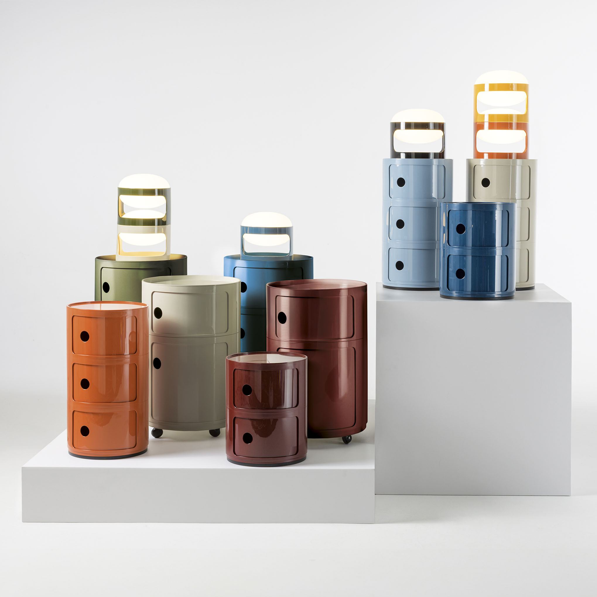 Présentés ici dans une version ronde de 42 cm, les Componibili d’Anna Castelli Ferrieri apparaissent sous un jour totalement nouveau. Une nouvelle apparence obtenue en utilisant un nouveau moule industriel qui met en valeur sa qualité et son esthétique. La palette s’enrichit de coloris déjà proposés pour la version de 32 cm, auxquels s’ajoutent des nuances inédites, où le style contemporain dialogue avec d’élégantes références au passé. Disponible avec 2 ou 3 éléments indissociables, cette nouveauté représente une évolution technique prête à valoriser un classique du catalogue. Disponibles dans les couleurs : bordeaux, gris tourterelle, orange, bleu pétrole, vert et blanc