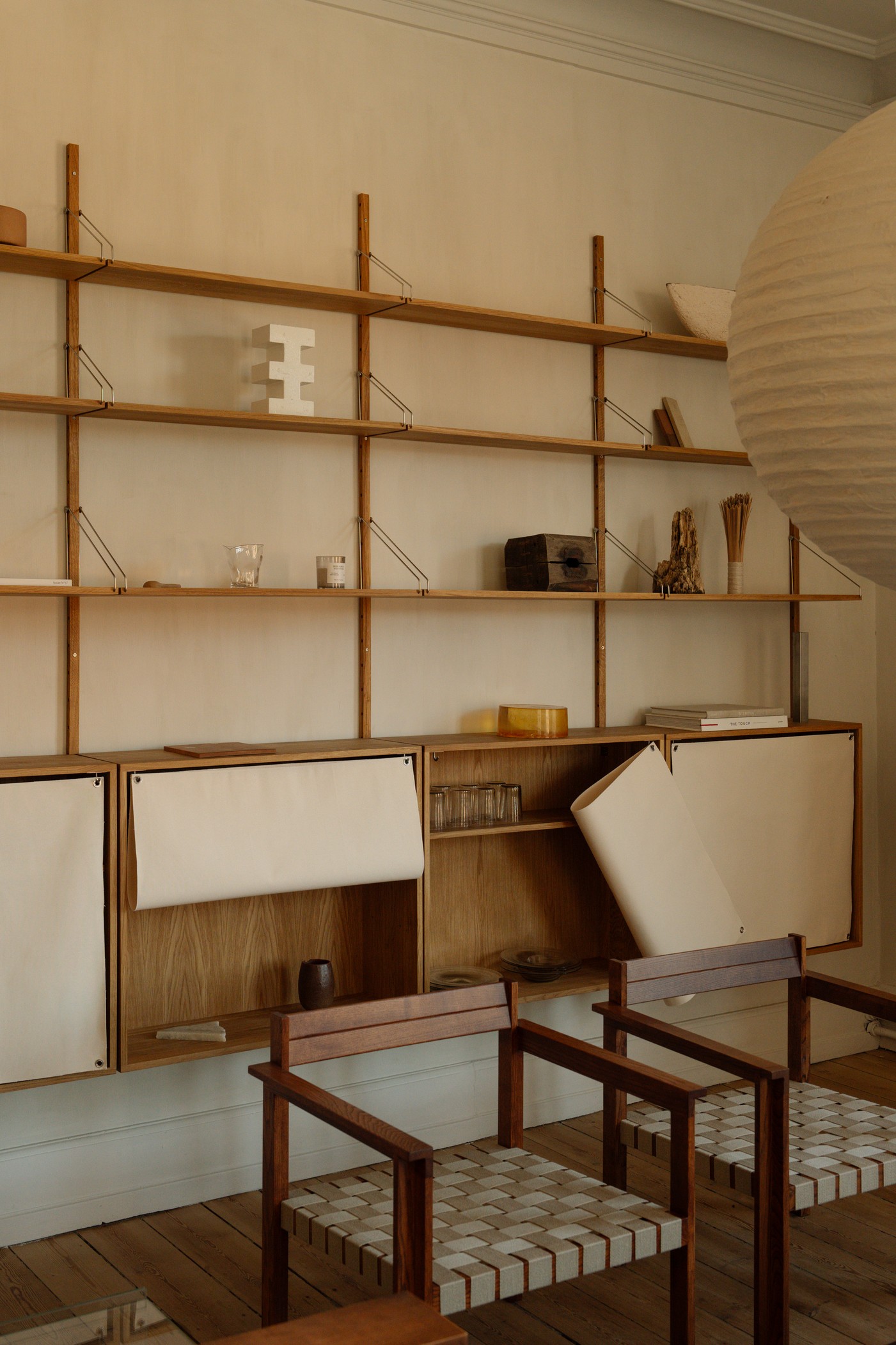 Les systèmes d’étagères sur rails ont été popularisés dès les années 1930 par les ébénistes scandinaves, avant d’être largement adoptés par les architectes et designers du mouvement moderniste. Avec le Shelf Library System, conçu pour FRAMA et lancé en 2016, Kim Richardt signe une interprétation raffinée de cette tradition, portée par un langage esthétique propre.