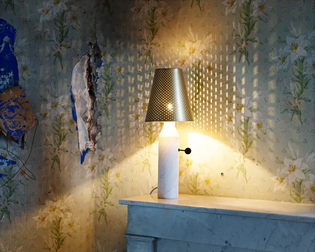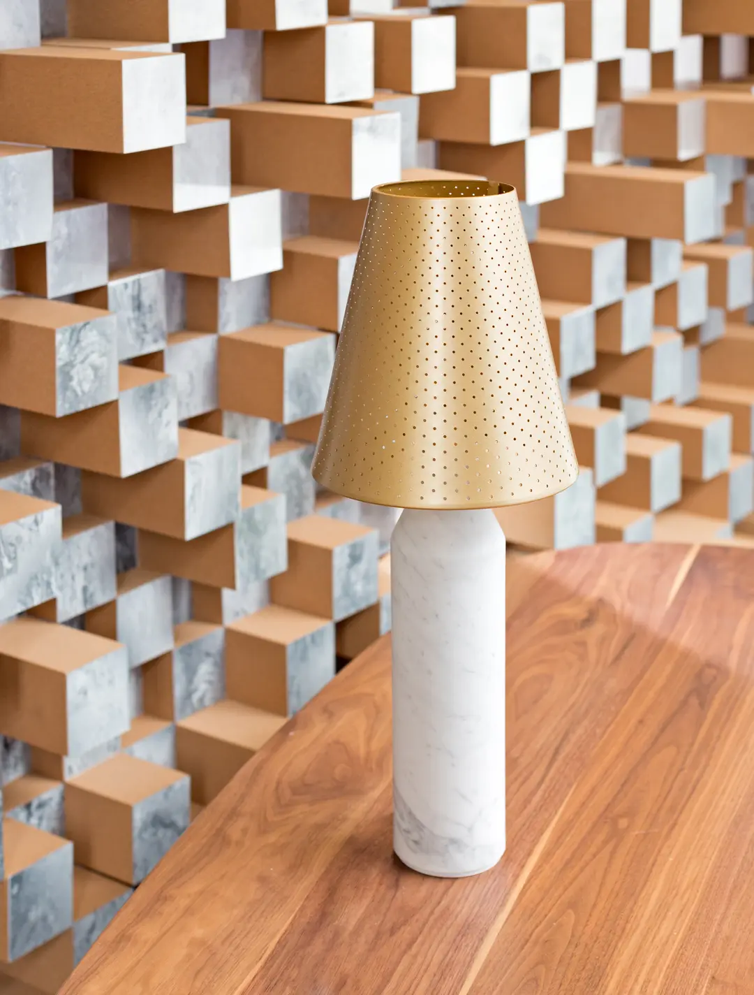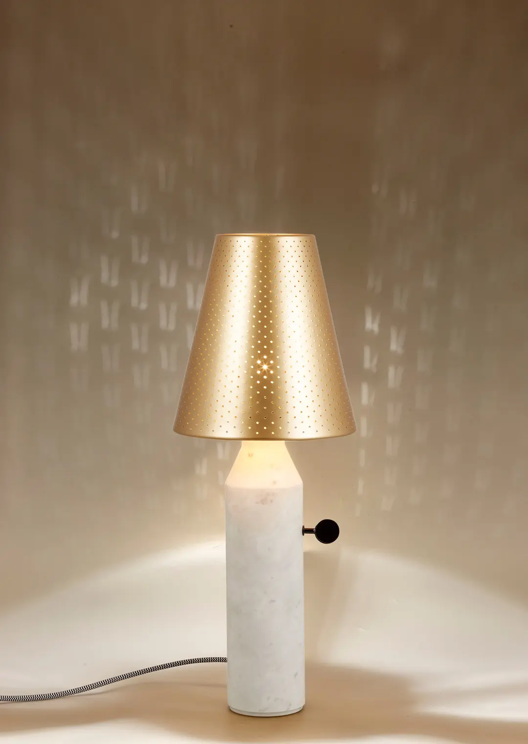 Vulcain est la lampe de table idéale : une silhouette classique, des matériaux nobles et de subtils détails qui font la différence, comme son interrupteur en forme de clé ou son câble bicolore noir et blanc. Sa lumière douce se diffuse à travers de fines perforations réalisées au laser dans l’abat-jour en laiton mat, créant une lueur chaleureuse et enveloppante.