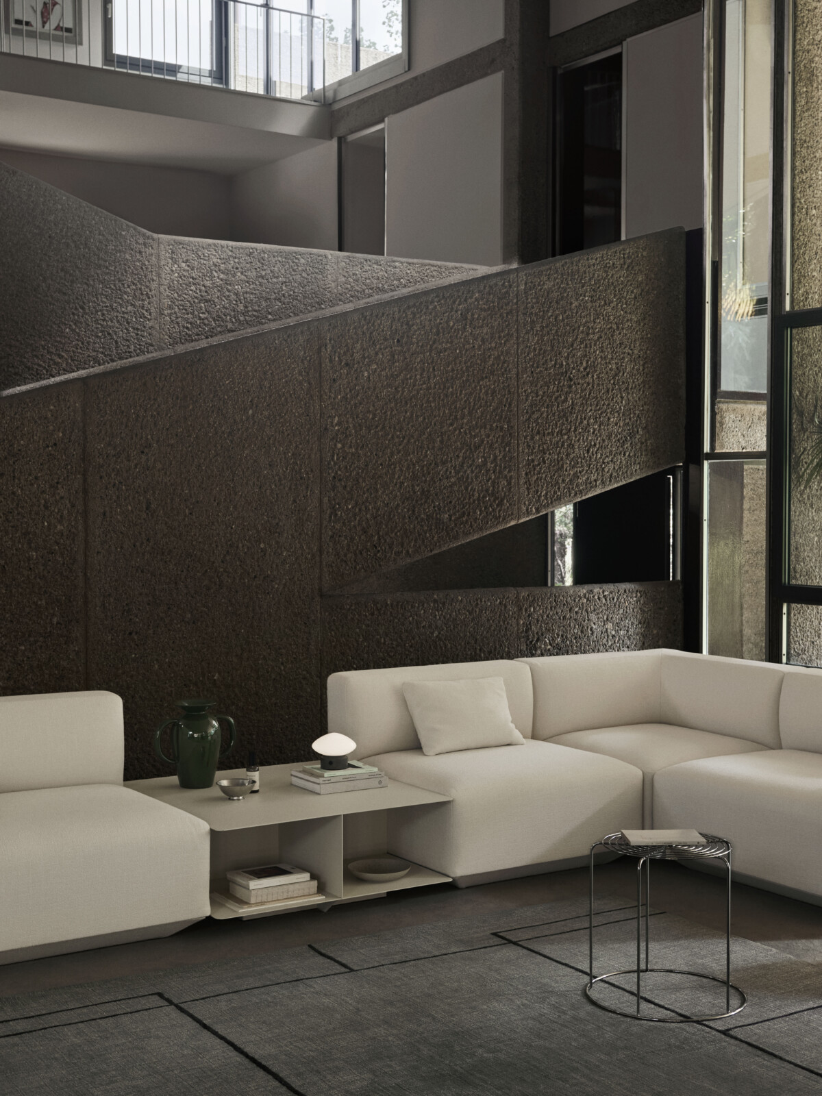Qu’elle soit utilisée comme pièce autonome ou nichée entre des modules de canapé, la table basse Develius sert d’espace pour stocker et exposer des objets, ainsi que de perchoir pratique pour un livre ou une tasse de café lorsque le besoin s’en fait sentir. Disponible en couleur ivoire ou Gris pierre.