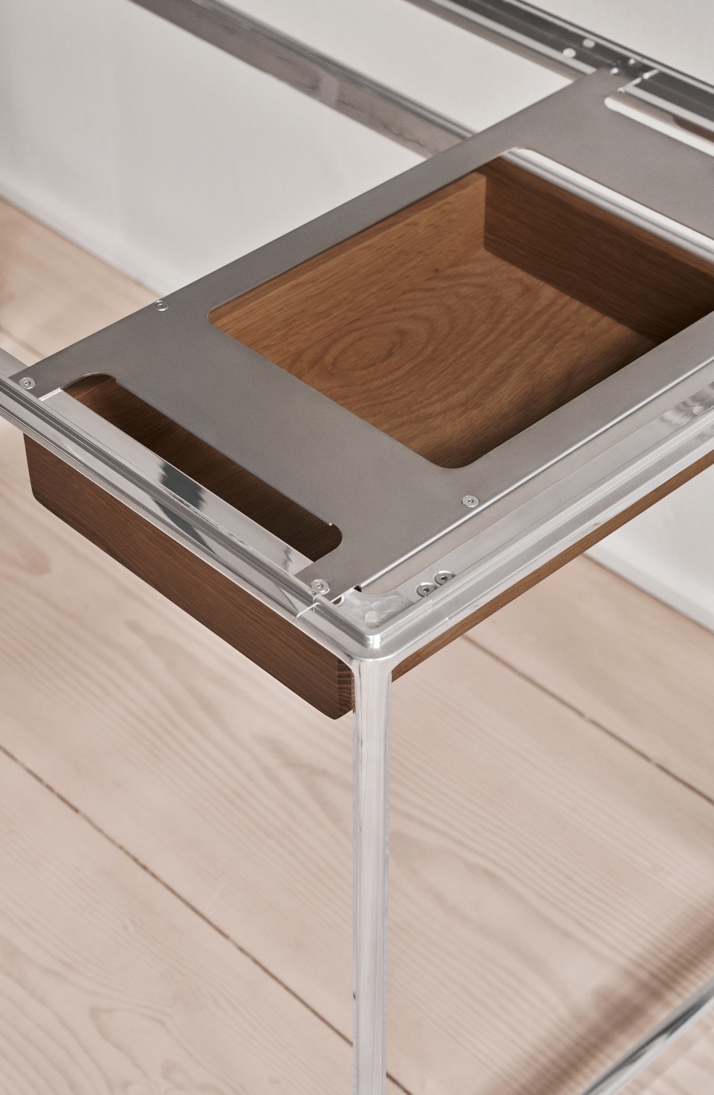 Un nouveau tiroir qui complète le bureau Vipp430. Il est disponible en noyer ou en chêne clair. Conçu pour être fixé sur le côté gauche ou droit, le tiroir ajoute une solution de rangement pratique mais raffinée au bureau Vipp430. Même avec deux tiroirs installés, un de chaque côté, il reste de la place pour placer confortablement une chaise pivotante entre eux.